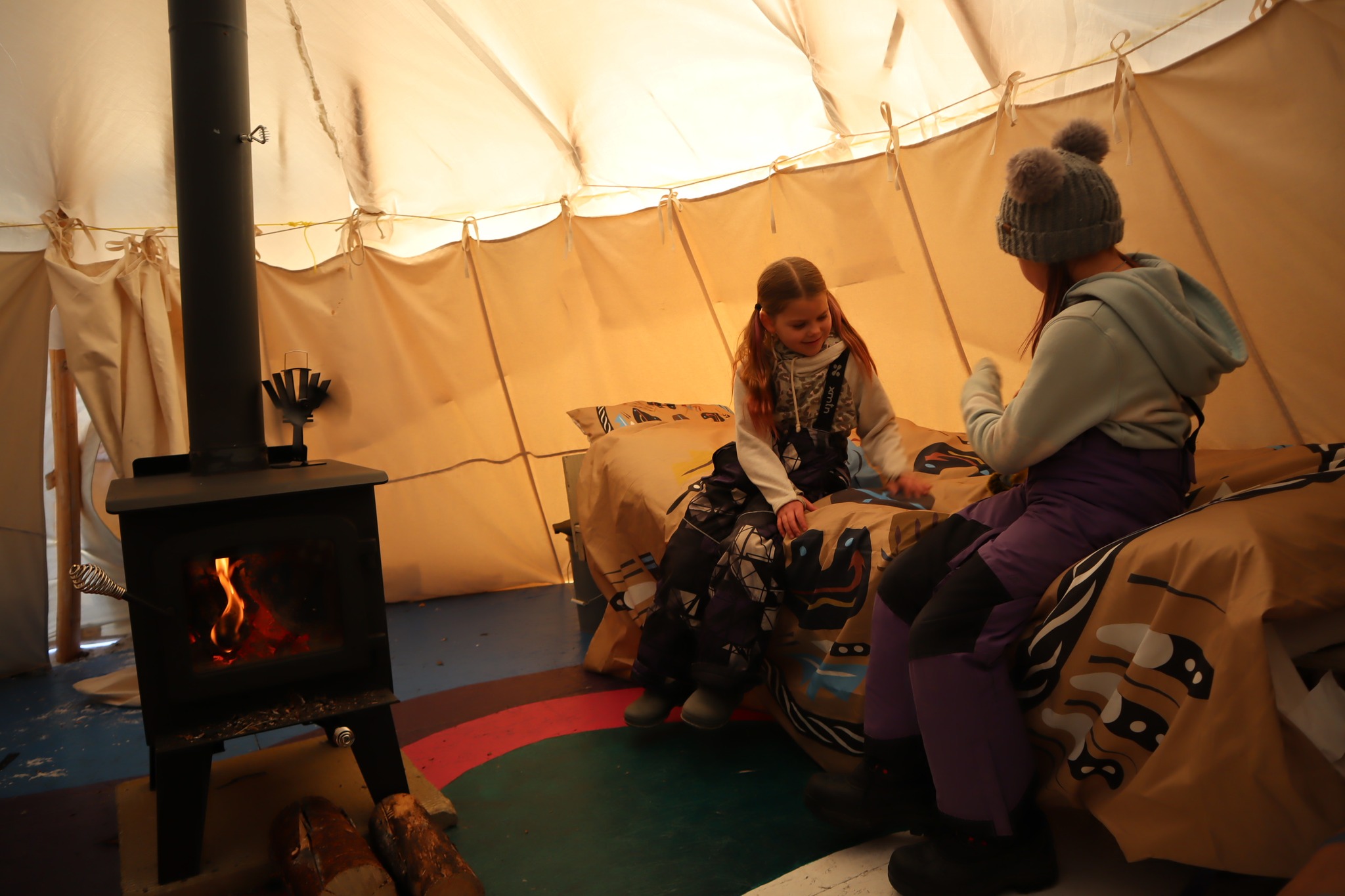 Visitors stay in traditional Indigenous tipis equipped with wood stoves, beds, and modern comforts, offering a balance between cultural authenticity and comfort.